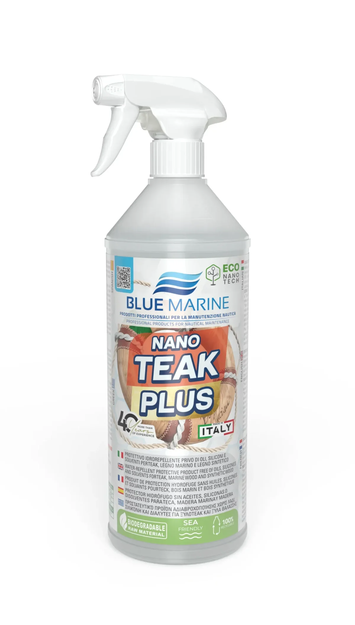 CARATTERISTICHE: “Nano Teak Plus” è un protettivo idrorepellente. Le nano molecole idrofobizzanti permettono al teak di respirare senza bagnarsi evitandone il deterioramento. Il prodotto garantisce una protezione dai raggi UV, dal salino e dalle intemperie. Inoltre non unge, non rende la superficie scivolosa, non cambia il colore originale del legno e non intacca il calafataggio (comenti).